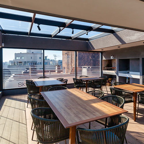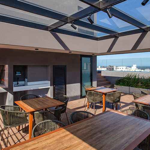 Parrillero en rooftop con amplio espacio para reuniones y vistas panorámicas.