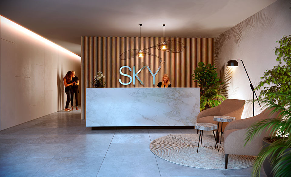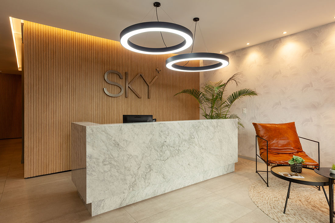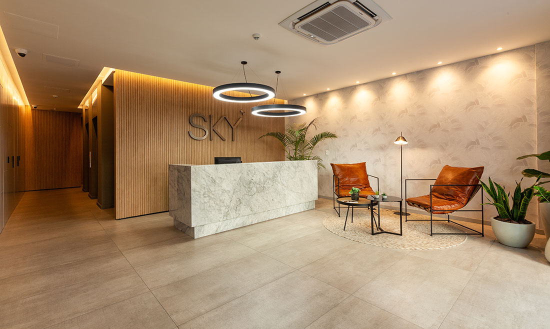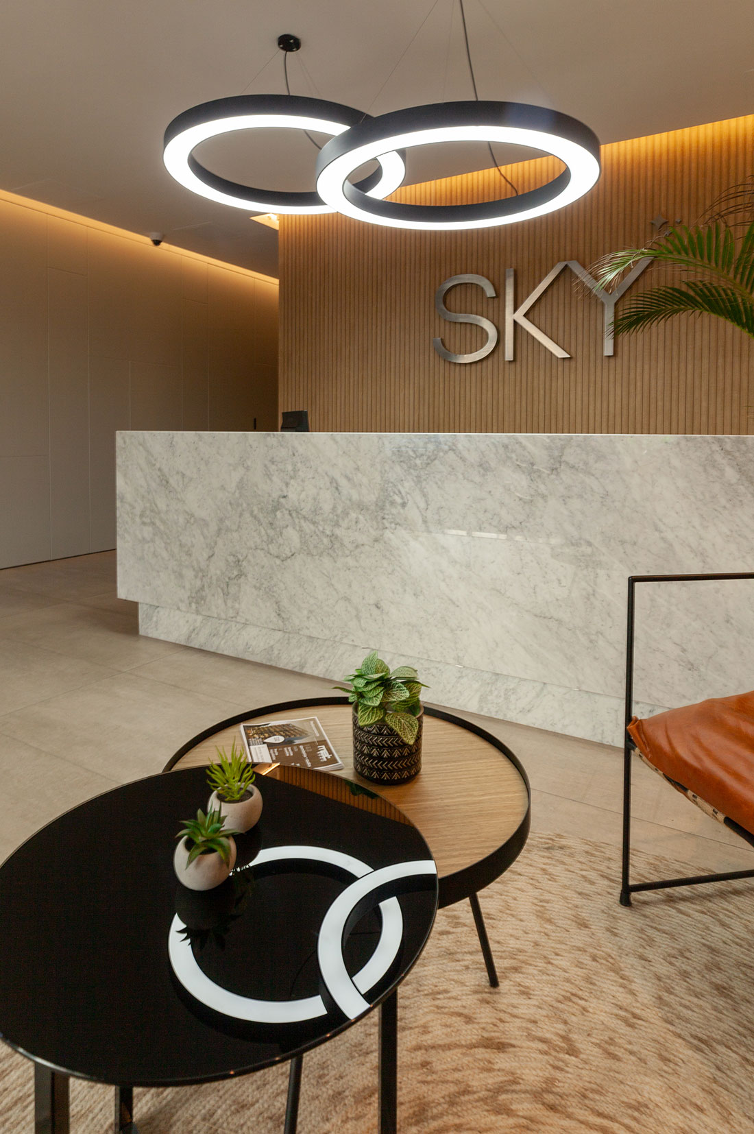 Los interiores acompañan la esencia de SKY: ambientes luminosos, calmos y abiertos, de acabados cálidos con texturas orgánicas y exquisito diseño. Las terrazas juegan un papel protagónico, ya que el espléndido paisaje exige que el espacio fluya hacia el exterior.